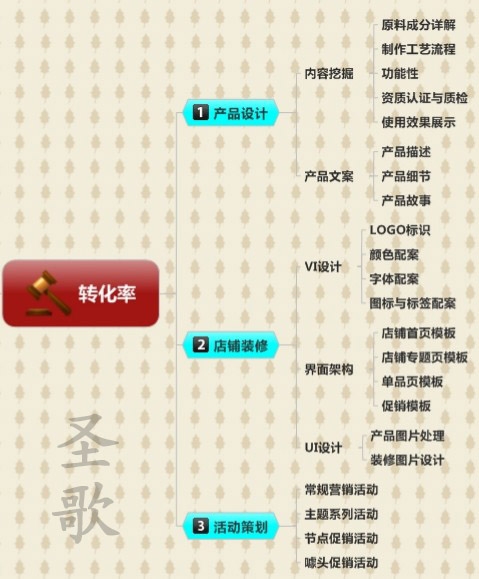 关于如何提高店铺转化率,可能很多人都能说上来不少方法。按工作内容不同来划分,我将之归为三类,一是产品设计,也可理解为产品的挖掘包装;二是店铺装修,这个大家容易理解,淘宝上卖的就是文字和图片,所以店铺装修是个大问题。三是活动策划。好的产品,好的页面展示,当然配合诱人的活动形式才容易产生最快的购买。