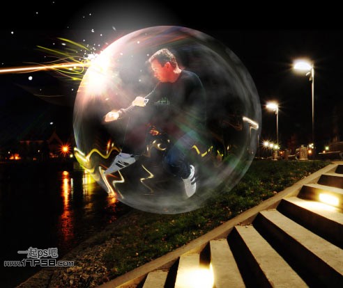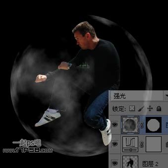| 6、把这个球体拖入帅哥文档中,画布扩大一下,图层模式强光,不透明度57%,效果如下。 |