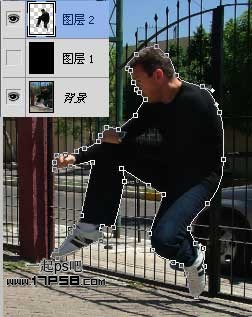 | 1、首先打开一幅功夫帅哥图片(点击打开)用钢笔抠出主体人物,转为选区,ctrl+J复制选区到新层,底部新建图层1,填充黑色。 |