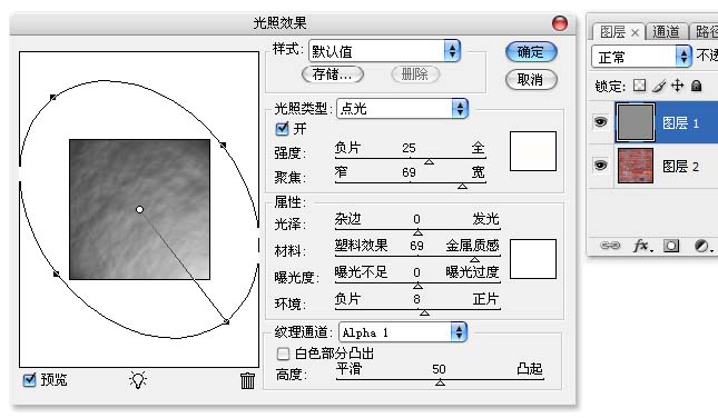 4、在三个通道中,前两个为作为光照效果的所需的纹理通道,“Alpha1通道”是为了获得墙面的不平整效果,“Alpha1通道副本”是为了获得破损部分,“Alpha1通道副本2”为删除不需要部分的选区通道。在“砖墙”图片的上新建一个图层填充灰色,执行“光照效果”滤镜,“纹理通道”选择为“Alpha1”。