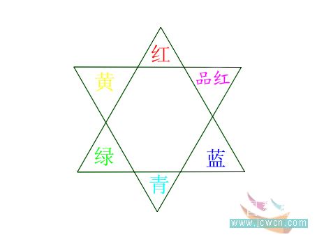 | 上面一张图是RGB三原色及其对应色的关系(有助于可选颜色的理解),接下来:我们在PS中画出如下图形(绿色和蓝色图层混合模式改为滤色): |