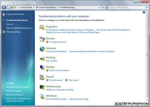据微软全球技术支持中心亚太区总经理柯文达先生介绍, 微软此次的windows 7开发离不开客服技术部的众多意见反馈,微软开发人员把这些用户最常遇见的问题直接“教”给了windows 7,因此windows 7能帮助用户解决大量用户而不必人工参与,微软在提高客服技术部工作效率的同时也极大地方便了用户。打开你的Windows 7控制面板,找到疑难问题解答入口(英文版Windows 7中称为Troubleshooting),打开后你将看到无论遇见从软件到硬件,再到网络和系统安全一系列问题都可以先交给Windows 7来自行解决。