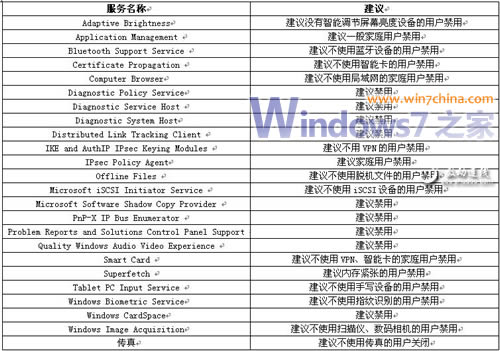 不过魔方列出的服务并不全面,更多可以关闭的系统服务还是要我们亲自动手来完成,请根据你的实际情况参照表1设置。