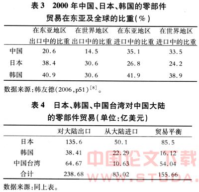 但是,进一步分析这种顺差转移效应的深层机理,则可以看出,这种顺差的转移实质上是东亚地区的分工形态发展的贸易流向后果。20世纪80年代中期以来,随着亚洲地区各国经济的发展及外资企业的大量投资,东亚地区形成了新的分工格局。这种分工格局的基本形态是基于生产阶段分工的一种垂直分工结构。具体说就是,生产的最后一道工序(组装工序)在中国大陆和东盟国家,技术密集型的产品的生产安排在日本以及韩国、中国台湾和新加坡等地,研发和最尖端技术产品的生产则主要安排在日本(韩友德,2006)。根据各国和地区比较优势的不同,同一产品的生产过程被分割成若干个生产阶段,形成了一种按生产阶段分工的垂直结构。