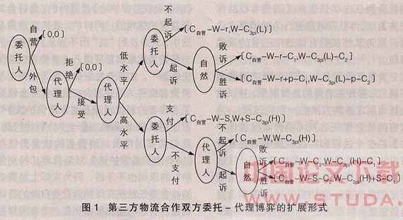 为简要说明,根据前面论述可合理假设委托人对“低水平服务”的对策是“不起诉”,对“高水平服务”的对策是“不支付”。而对“不支付”的对策是“不起诉”。则委托人通过外包物流所能获得的收益为:(1-p1)(C自营-W-r)+p1(C自营-W)=C自营-W -r(1-p1)