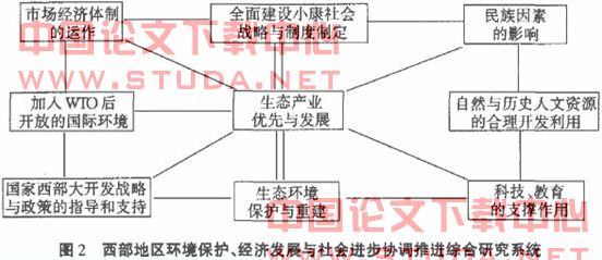 2003年l2月,笔者为参加由陕西师范大学西北历史环境与经济社会发展研究中心与北京大学孙中山思想国际研究中心、香港珠海书院亚洲研究中心、台湾政治大学国际关系研究中心联合举办的“西部大开发与环境保护国际学术研讨会”提交的《西部大开发中的生态环境制约作用与应对方略》一文中,笔者也为西部地区环境保护、经济发展与社会进步协调推进工作,依人地关系是一“多元复合双向制约体系”的理论观点,对人为活动方面设计出多元复合模型图(见图2)。从下图中可以看到,只有政府将生态环境保护与重建置于基础地位,在国家西部开发战略与政策的指导和支持下,在科技、教育事业的支撑下,合理利用本地区自然与历史人文资源及加入WTO后开放的国际环境所提供的条件,充分考虑民族因素的影响,运用市场经济体制的运作机制,进行生态产业(包括工业、农业、林业、牧业、旅游业、服务业等)优选,并促其快速发展,才能顺利达到全面建设小康社会的宏伟目标。