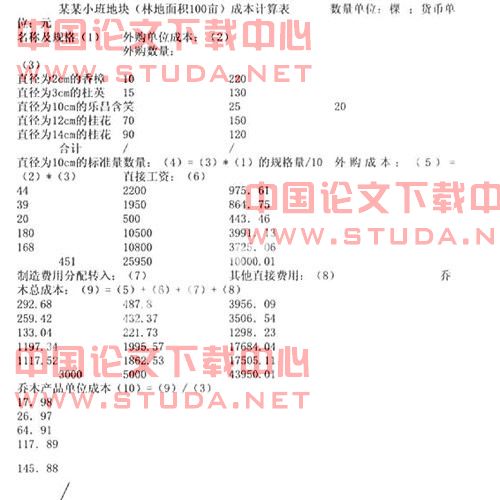 外购小苗分别以外购成本(包括购买价款、相关税费、运输费、保险费以及可以直接归属于购买该资产的其他支出)采用个别计价法按名称、规格进行明细核算计入产品成本,其他的直接费如直接工资,制造费用分配转入部份、其他直接费用可采用约当标准量法来进行分摊确认,所谓约当标准量法就是在月未,每个小班地块不计乔木的品种只按相同规格的乔木的数量汇总,把直径为10cm的乔木当作标准量乔木,将直径小于10cm和直径大于10cm的乔木折合成直径为10cm的标准量乔木,然后相加得到标准量乔木的总量,再和归集的费用相除,得出费用分配率,用费用分配率去乘标准量乔木的数量,从而计算出不同规格乔木的生产成本。林地建设时可假设乔木是在同一时间一起种植,而且各种费用是以乔木规格的大小承担费用,所以不同品种但规格相同的乔木除了乔木本身的原始成本(外购成本)不一样外,其他费用如直接工资,制造费用分配转入部份、其他直接费用都可按约当标准量法来进行分配和核算,例如:某某小班地块(林地面积100亩)共有直径为2cm的香樟220棵、直径为3cm的杜英130棵、直径为10cm的乐昌含笑20棵、直径为12cm的桂花150棵、直径为14cm的桂花120棵,外购单位成本分别为10元、15元、25元、70元、90元,当期该小班地发生直接工资10000.01元、制造费用分配转入3000元、其他直接费用5000,按上述的成本计算方法进行分配具体如下表: