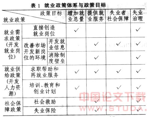 作为系统性的公共政策体系,就业政策包含多个子政策(见表1):一是就业需求政策,包括直接创造就业岗位、开发就业信息、消除制度壁垒,改善就业环境。二是就业供给政策,包括求职帮助和再就业服务、培训、创业等组成的开发人力资源的政策体系。三是社会保障类政策,包括社会救助和失业保险等。因而就业政策体系具有多重目标。首要目标就是增加就业总量,开发就业岗位的政策可以直接增加就业总量,改善就业市场环境、消除制度壁垒等政策可以间接性的扩大就业总量。其次是提供就业服务,职业介绍、教育培训可以提高求职者就业能力,满足迅速变化的劳动力市场中的多样化需求;对劳动市场中弱势群体(下岗职工、农民工、妇女和残疾人等)提供服务可以平稳市场的运行。最后,社会保障性目标如失业保险、失业救济等,虽然具有事后性、补救性的消极意味,但能够使劳动者在破产、疾病、工伤等非自愿因素而遭致失业和伤害时,帮助其恢复劳动能力,学习新的技能并重新参与竞争,稳定劳动力质量和数量的供给。上述政策最终都落实于失业治理这一总政策目标。可见,就业政策不是单纯的、短期性的扩大就业总量,它的公共产品性质要求从长远角度根本性的解决失业问题。