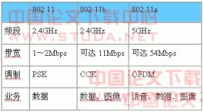在802.11的基础上,IEEE相继推出了802.11b和802.11a两个标准。三者之间技术上的主要差别在于MAC子层和物理层。802.11b使用动态速率漂移,可因环境变化,在11 Mbps、5.5 Mbps、2 Mbps、1 Mbps之间切换,且在2Mbps、1Mbps速率时与802.11兼容。 802.11a工作在5GHz频段,物理层速率可达54Mbps,传输层可达25Mbps。可提供25Mbps的无线ATM接口和10Mbps的以太网无线帧结构接口,以及TDD/TDMA的空中接口。