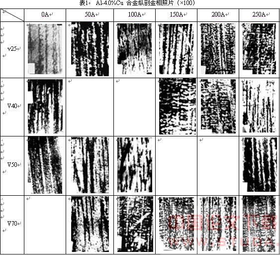 各组 Al-4.0%Cu 合金纵剖金相照片(×100)见表 1。