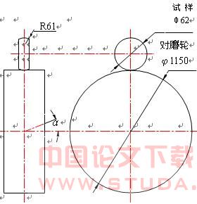 对磨轮接触面为平面。试样接触方式有两种,第Ⅰ种为半径 R61 的弧面接触,如图 3 所 示。半径 R 的大小是依据线路轮轨的接触方式计算确定,需试样和对磨轮接触面椭圆的长 短半轴之比与线路钢轨轮轨接触椭圆的长短半轴之比相等。此接触弧 R61 是根据 60 kg/m 钢